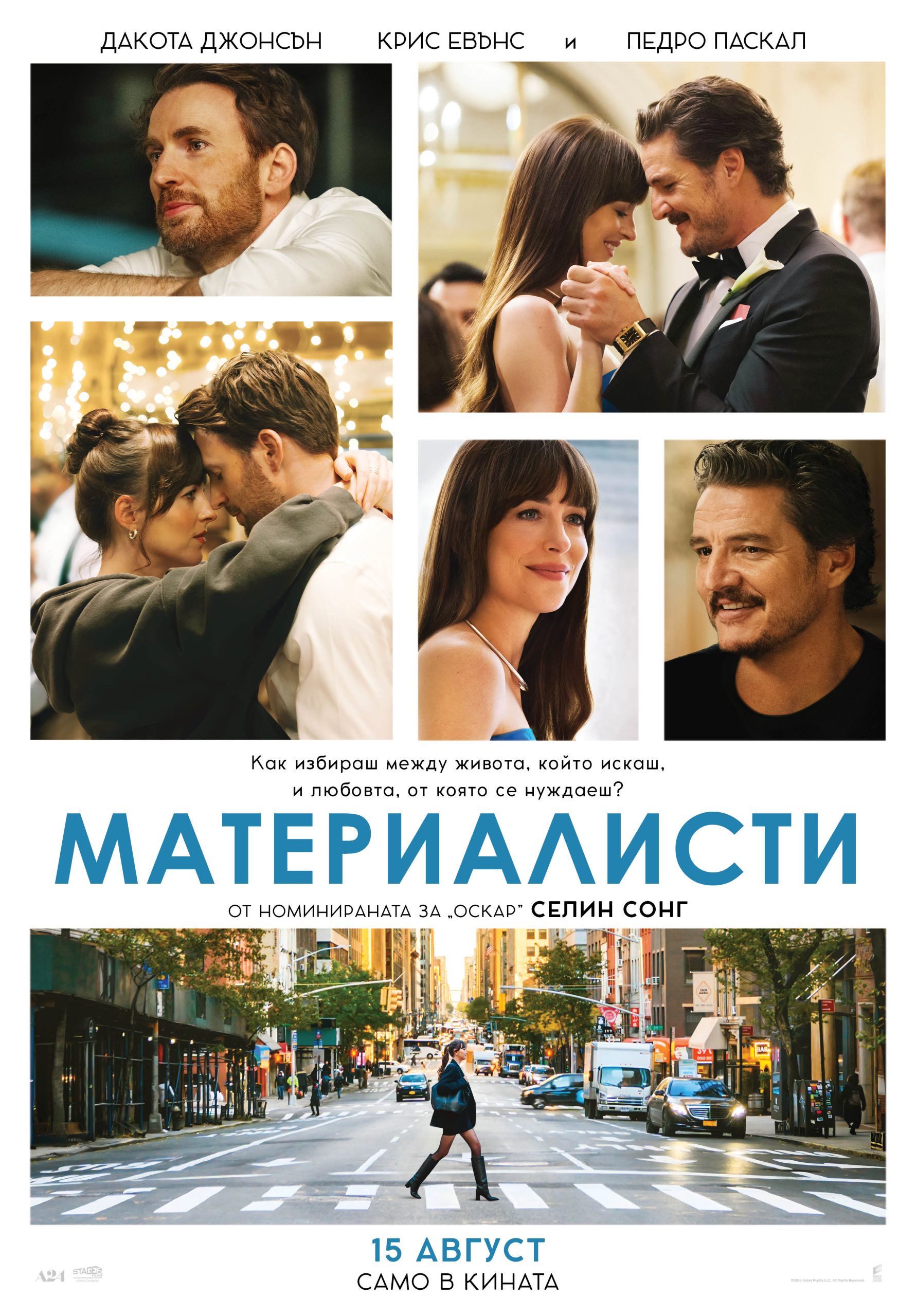 Материалисти. След като впечатли публиката и критиката с повече от прекрасния си дебют Минали животи, номинираната за „Оскар“ режисьор и сценарист Селин Сонг се завръща в кината с тази стилна и интелигентна романтична комедия. Подкрепена от звезден актьорски състав в лицето на Дакота Джонсън, Педро Паскал и Крис Евънс, Сонг ни отвежда в динамичния и криещ редица изненади Ню Йорк, където любовта, личните амбиции и финансовите интереси често се преплитат по неочаквани и болезнено човешки начини.